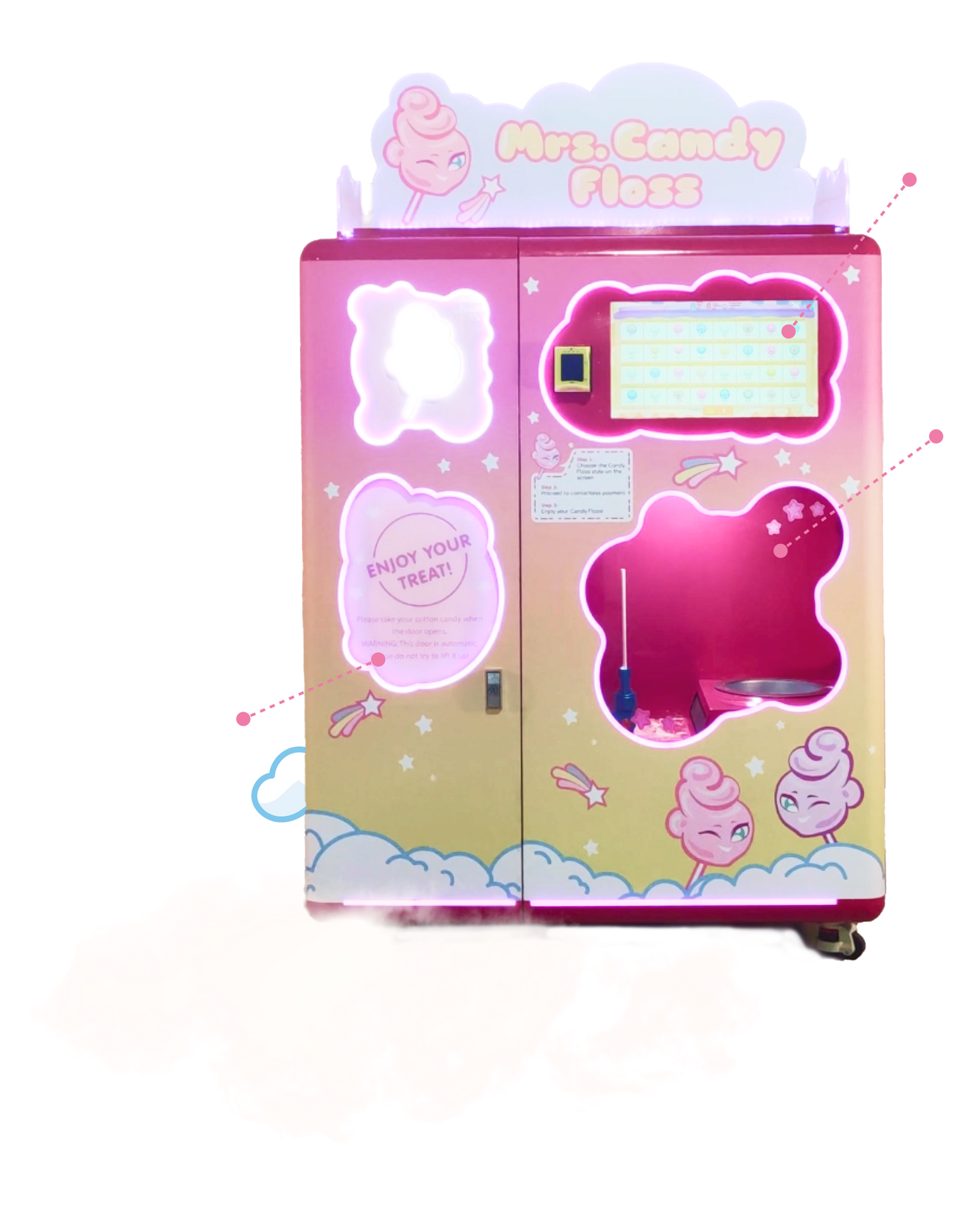 Discover our automated vending machine designed to deliver not just cotton candy but joy in every bite.
